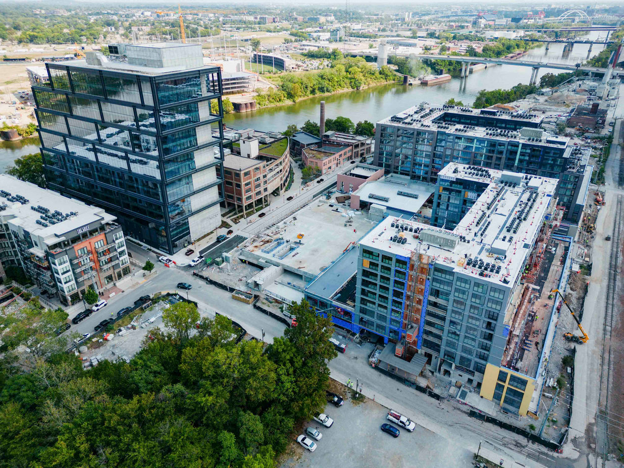 Situated on the west bank of the Cumberland River in Nashville's Germantown neighborhood, the Neuhoff District is a blend of residential and commercial spaces carved out of a site previously used as a food processing facility. The brownfield nature of the site required thorough soil assessments, remediation, vapor intrusion evaluations, and asbestos abatement, all aligned with the requirements of the Tennessee Department of Environment and Conservation’s Voluntary Oversight and Assistance Program (TDEC VOAP). While assessment by a previous environmental consultant anticipated isolated areas of contamination, construction revealed widespread soil contamination across the site. The project also was challenged by its scale and the need for integration into the surrounding dense residential community, requiring sensitive adaptive reuse of existing structures.